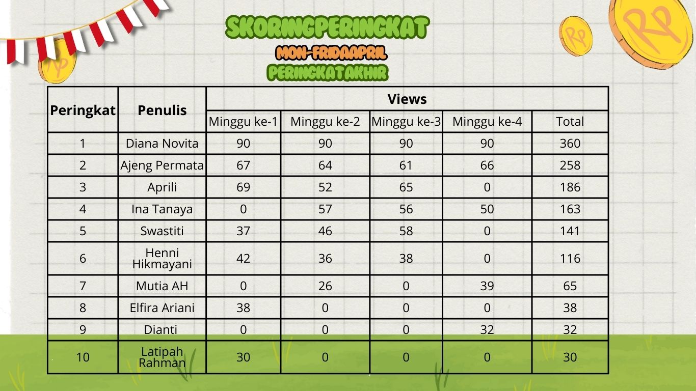 - Menulis minimal 5 artikel perminggu dari tema yang diberikan. Jika full menulis senin-jumat, akan lebih dekat sebagai pemenang.